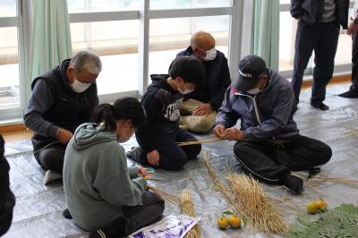 午後から公民館長さんをはじめ、愛護会長さん、公民館主事さん、地域の方々、保護者の皆さんにお越しいただき、しめなわ作りについて教えていただきました。